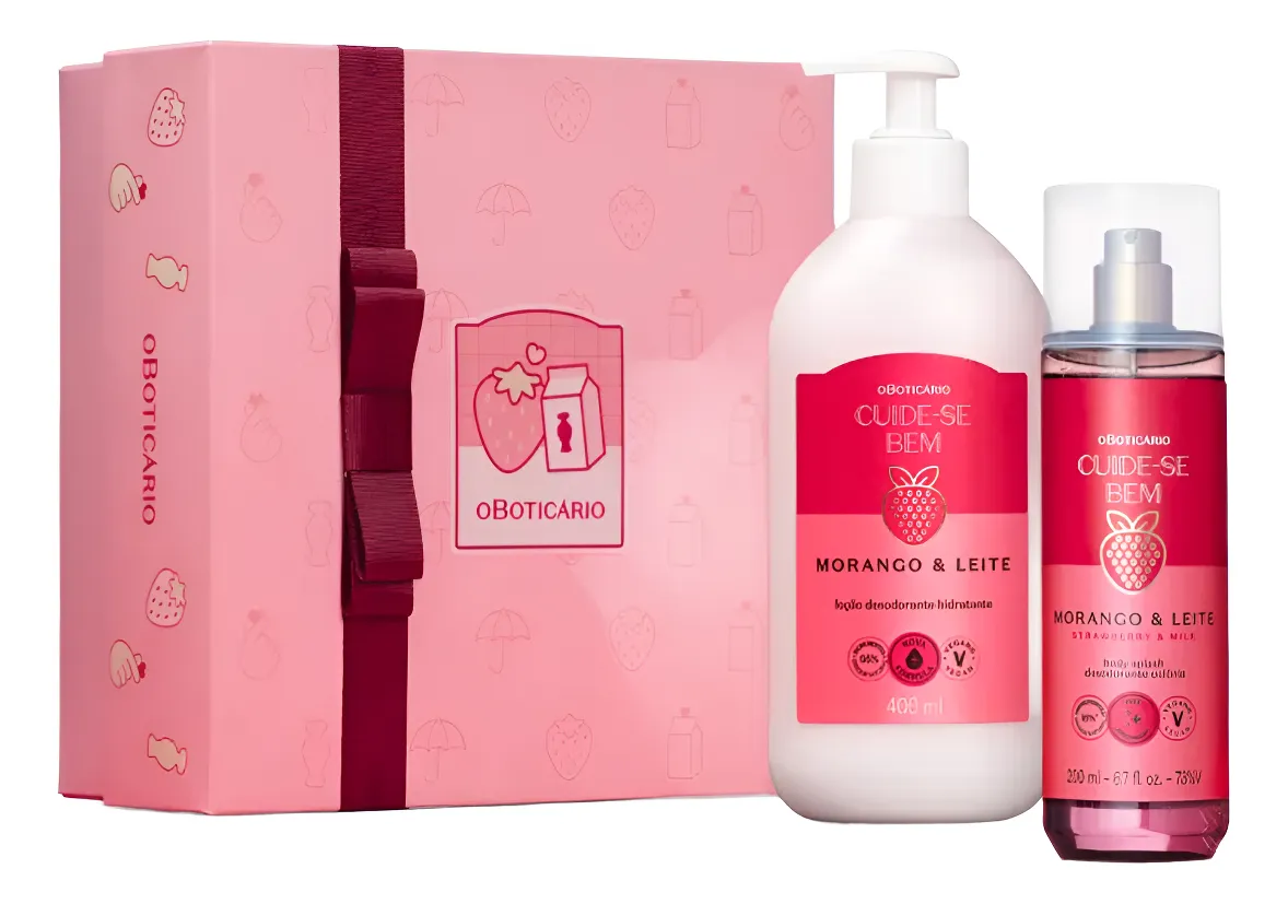 O kit vem com uma caixa personalizada pronta para presente, e une dois queridinhos da marca com fórmula vegana e fragrância deliciosa de morango com leite.
